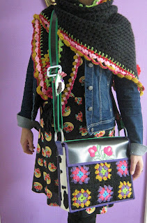 Voor de tas haakte ik granny´s voor de omslagdoek streepjes in bijpassende kleuren. Onderaan een wiebelrandje en natuurlijk bloempjes om het op te leuken. Ik trok een leuk jurkje aan en dochter maakte er een fotootje van. O,ja omslagdoek heb ik Lucy genoemd.